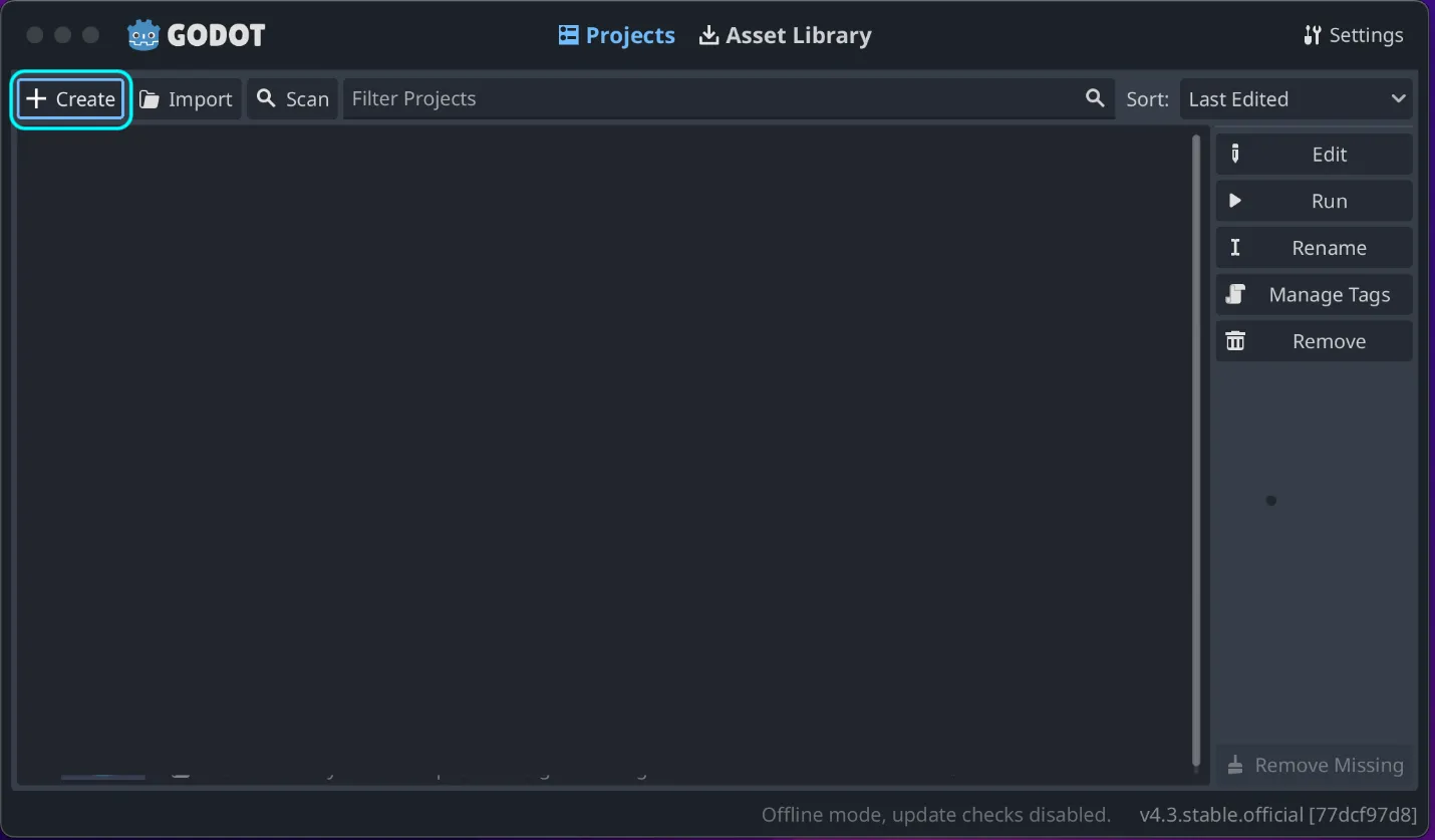 Godotを起動し、「Create」をクリックしてプロジェクトを作成します。適当な名前を付け、2Dゲーム用のフォルダを指定します。