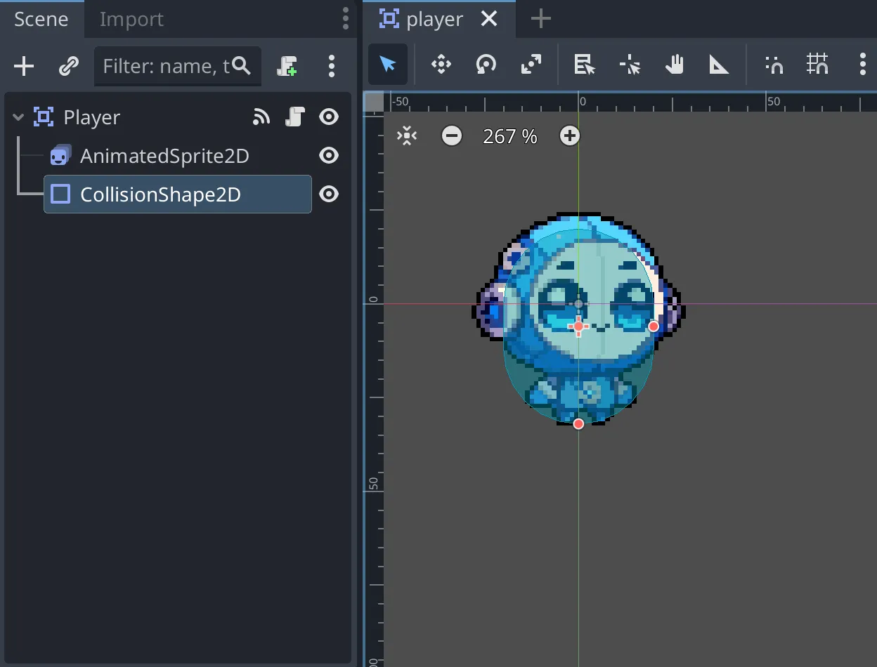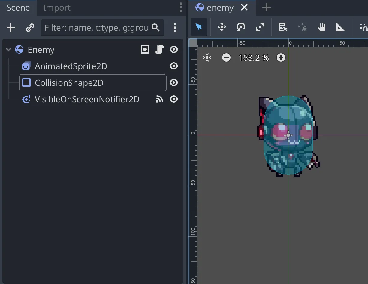 Area2Dの子コードとしてAnimatedSprite2DとCollisionShape2Dを追加ます。