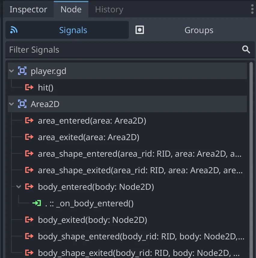 _on_body_enteredをシグナルを設定してプレイヤーが別の物体と衝突した際の処理をできるようにします。