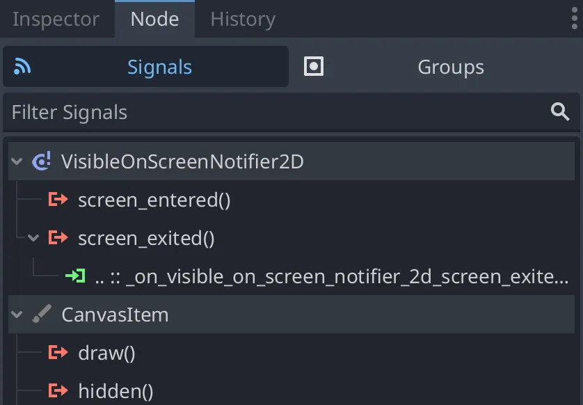 VisibleOnScreenNotifier2Dのシグナルscreen_exited()をスクリプトの_on_visible_on_screen_notifier_2d_screen_exitedと設定します