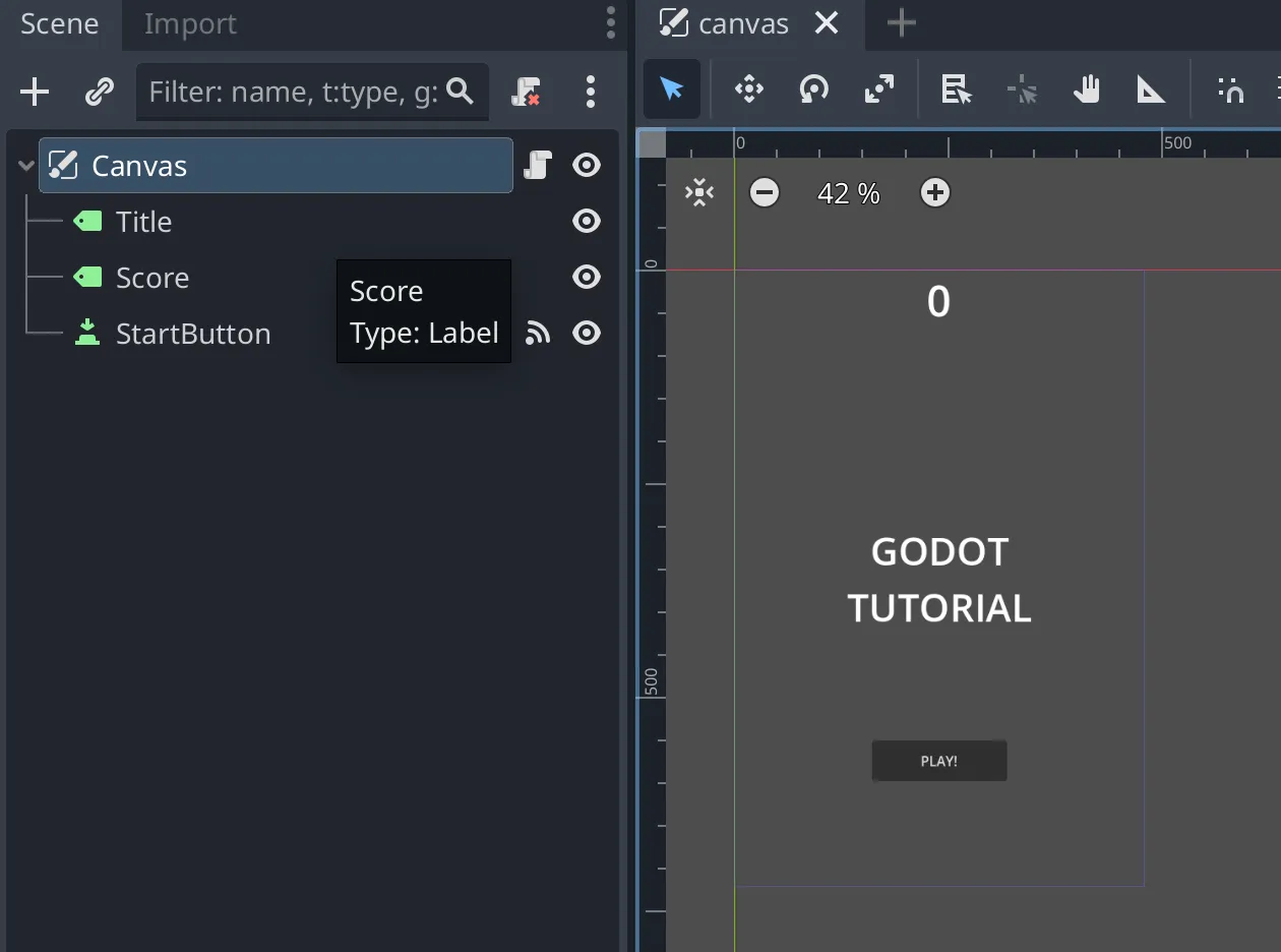 CanvasLayerの子コードとしてタイトル用のLabel, スコア用のLabelとスタートやリスタートのButtonを追加ます。