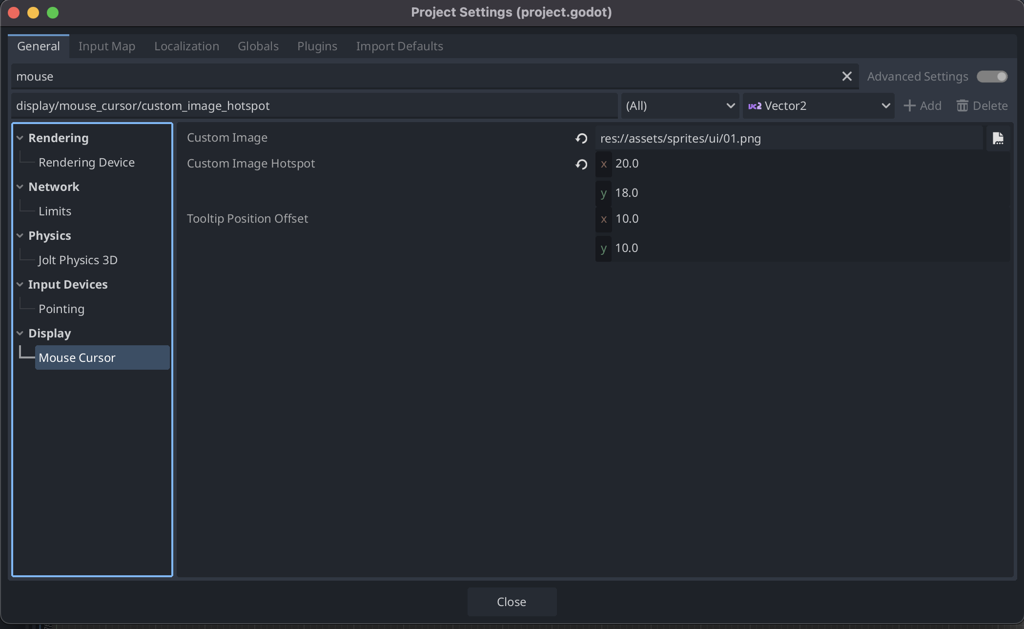 Project Settingsを開いて、検索のところにmouseで検索してDisplay → Mouse CursorのCustom Imageに設定したいマウスカーソルの画像を選択します。