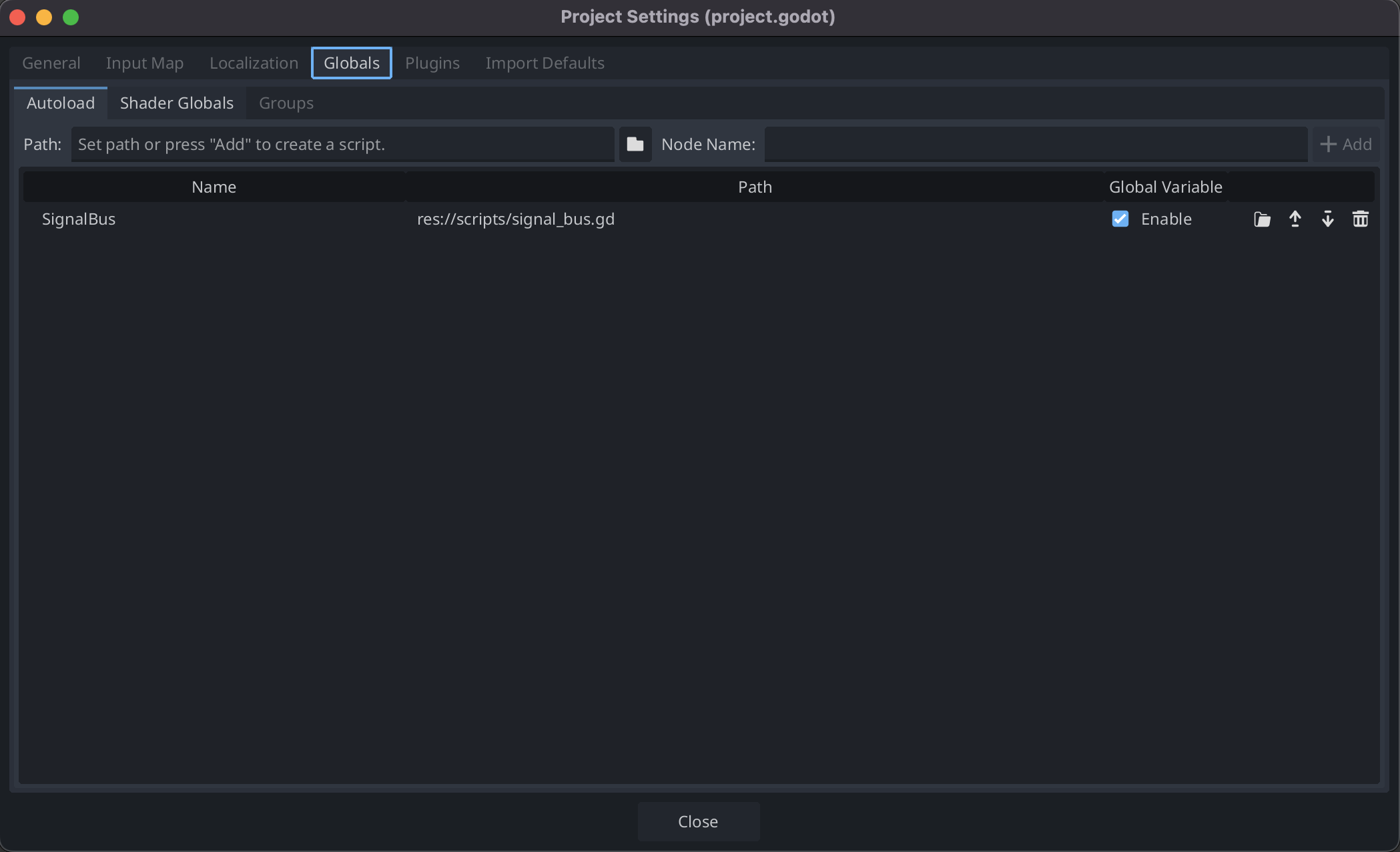 次に Project SettingsのGlobalsに先ほど作成したスクリプトをSignalBusという名前で追加します。