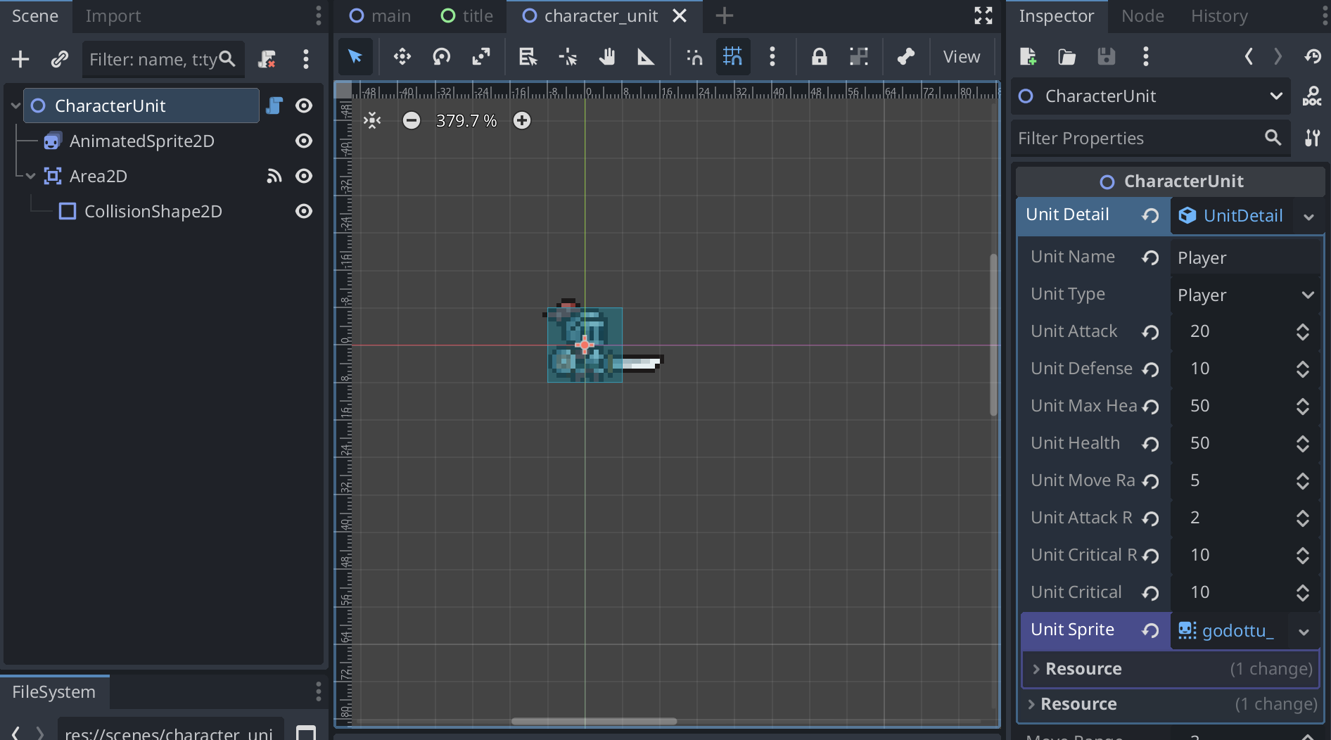 CharacterUnit (Node2D)├─ AnimatedSprite2D├─ Area2D └─ CollisionShape2DAnimatedSprite2D:移動・待機などのアニメーション表示用 Area2D + CollisionShape2D:マウス入力(クリック・ホバー)の検出用