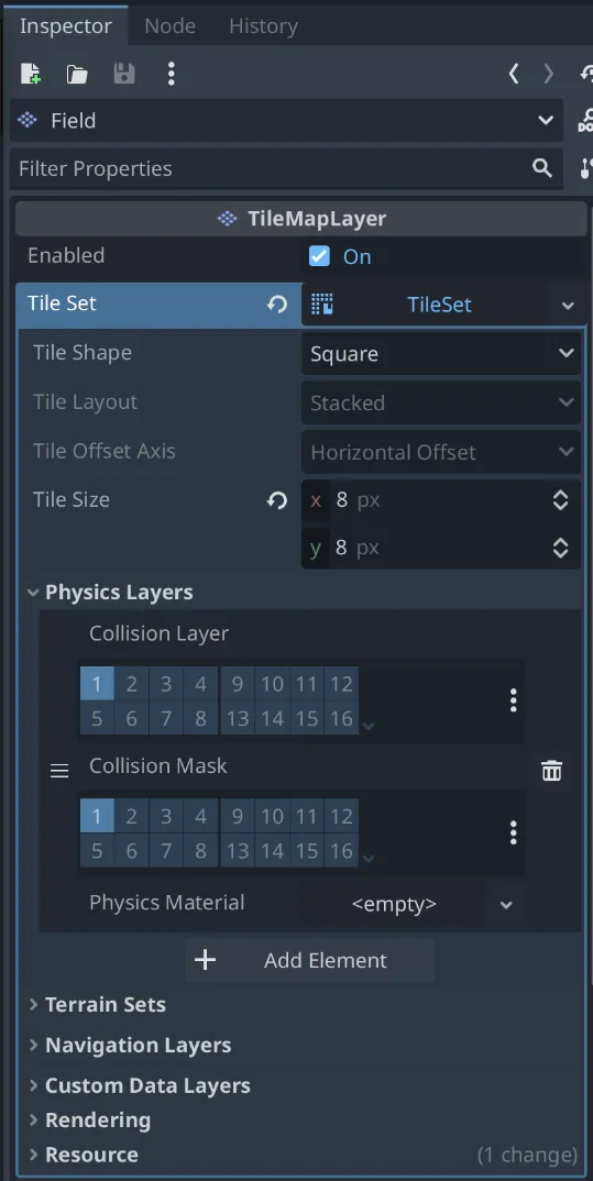 Fieldノードを選択し、右側のインスペクタでTile Setを設定します。Tile SetのTile Sizeのxを8pxにします。(タイルによって調整します)また壁などの障害物の判定のために