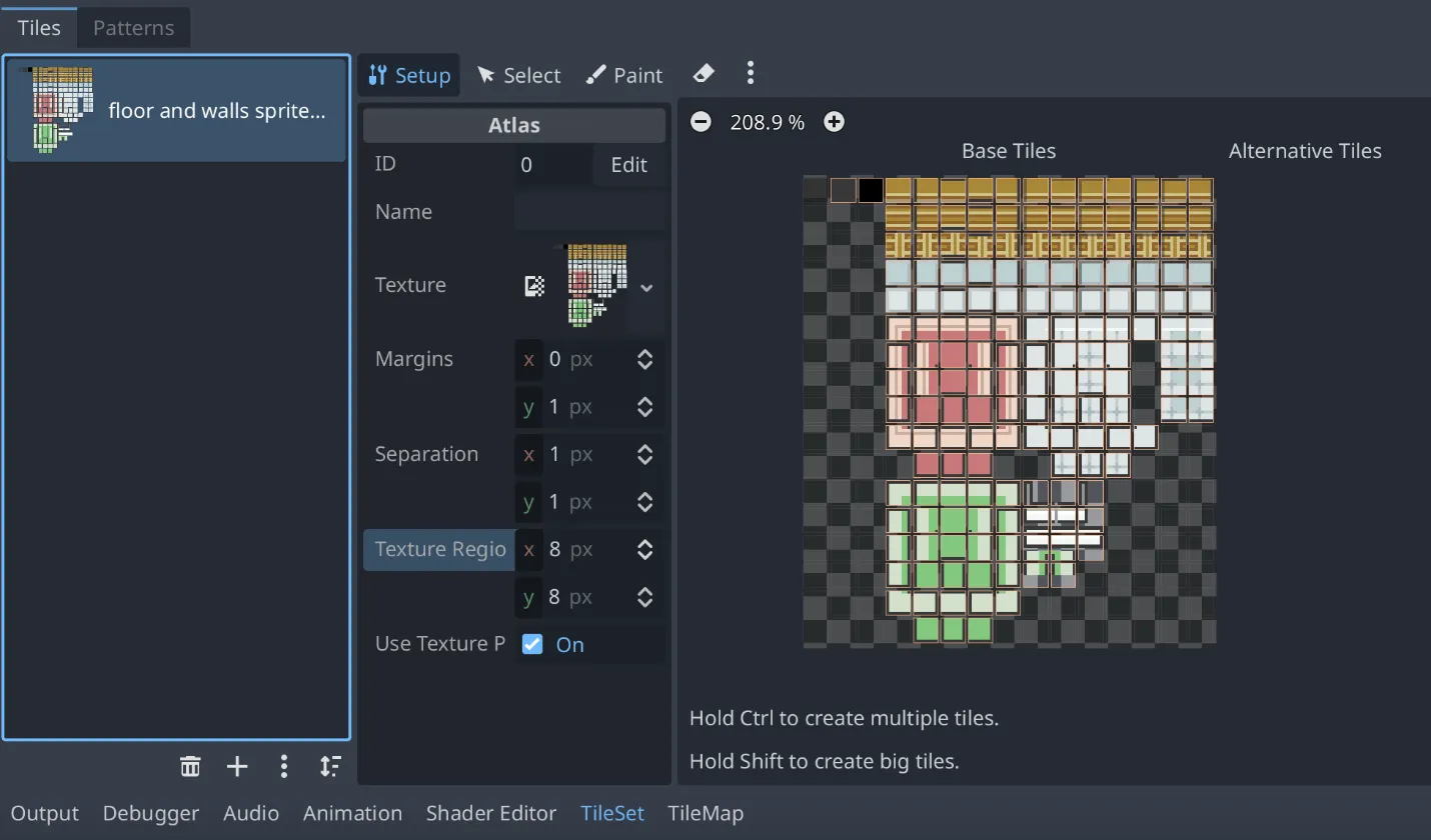 Tile Setを作成するために、用意した画像(タイルセット画像)をインポートします。床や壁の画像を並べたシートを用意します。インポートしたタイルセット画像をTile Setリソースにドラッグ&ドロップします。