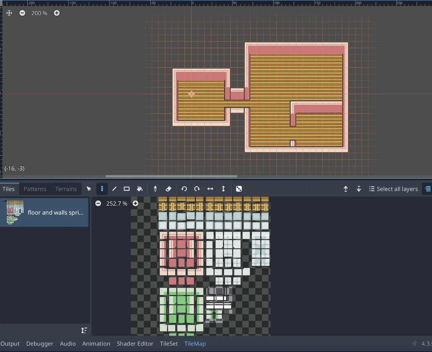 TileMapを選び、塗りたいタイルを選んでペンマークを選択してマップ上に配置します。床や壁、扉など、ゲームのマップを作成していきます。