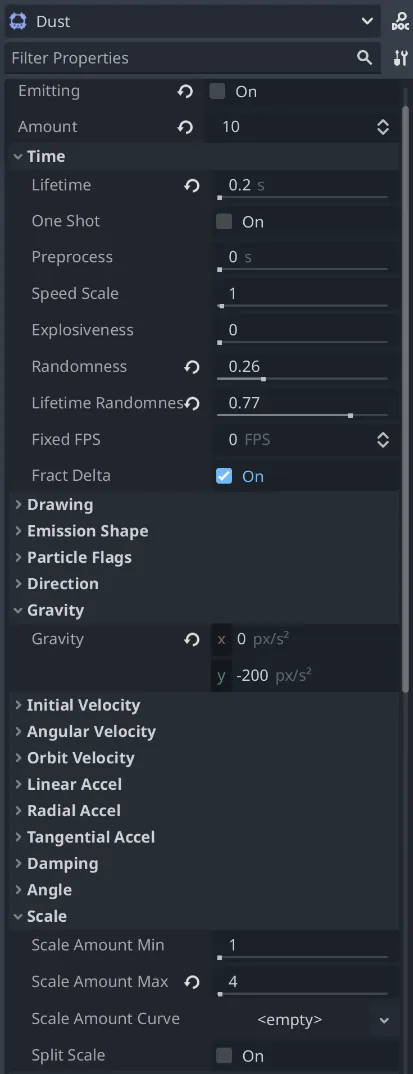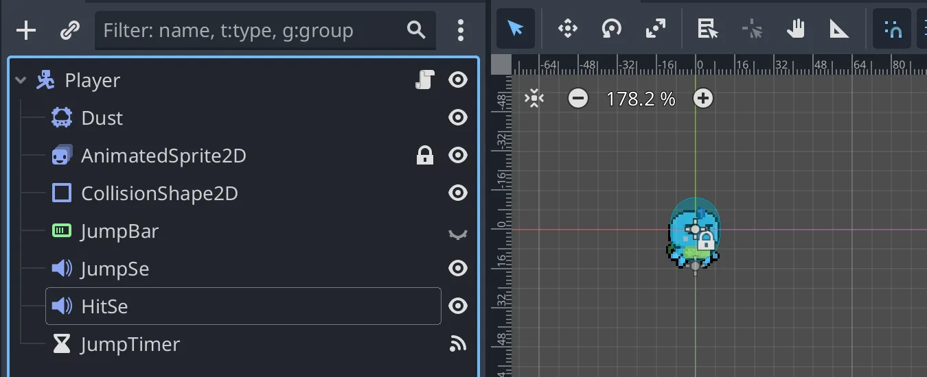 Player (CharacterBody2D)├── Dust (CPUPatricles2, 砂煙エフェクト)├── AnimatedSprite2D (アニメーション管理)├── CollisionShape2D (物理判定)├── JumpBar (ProgessBar, ジャンプバー)├── JumpSe (AudioStreamPlayer2D, ジャンプのサウンド再生)├── HitSe (AudioStreamPlayer2D, 衝撃のサウンド再生)├── JumpTimer (Timer, ジャンプタイマー中の処理)Dust → 砂煙エフェクトCollisionShape2D → 物理判定、CapsureShape2Dにしてプレイヤーを囲むJumpBar → ジャンプバーJumpSe → ジャンプのサウンド再生HitSe → 壁に当たった時の衝撃のサウンド再生JumpTimer → ジャンプタイマー中の処理を行うタイマー