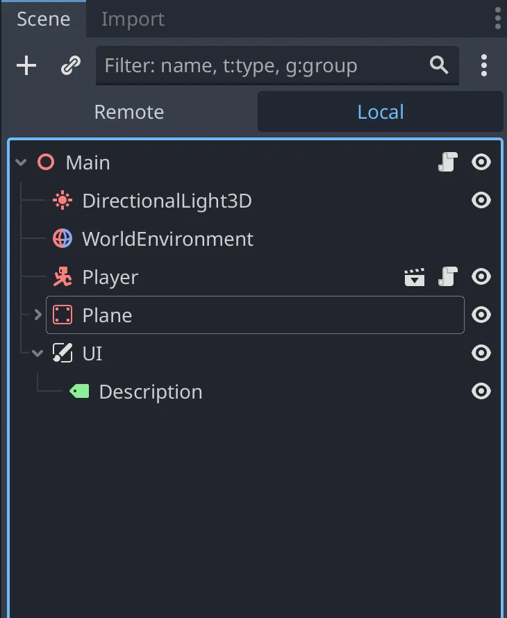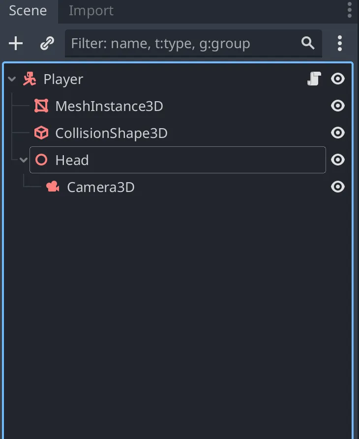 Playerを選択し、位置を 0, 1, 0 に設定します(地面から少し浮かせる)。プレイヤーの最終的なノード構造は以下のようになります: