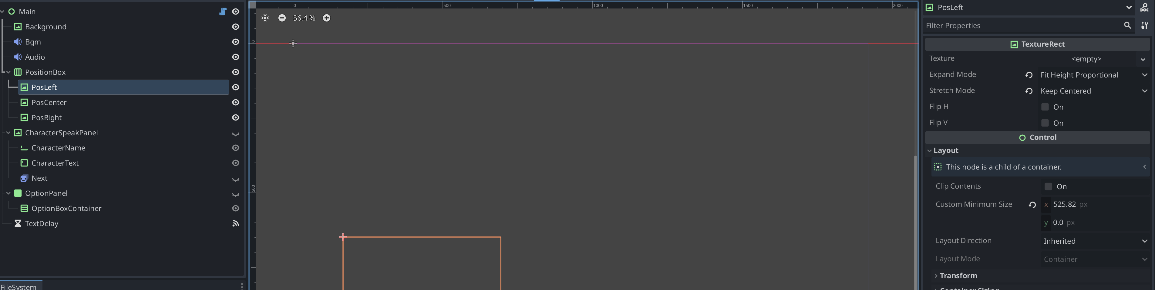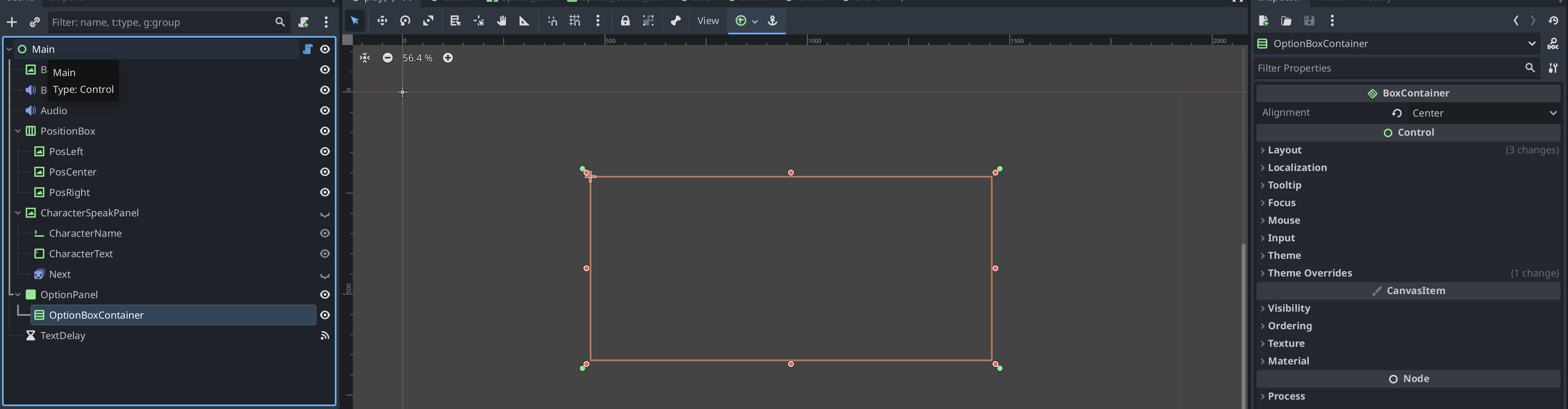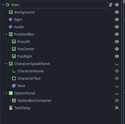 Main (Control)├── Background (TextureRect)├── Bgm (AudioStreamPlayer2D)├── Audio (AudioStreamPlayer2D)├── PositionBox (HBoxContainer)│ ├── PosLeft (TextureRect)│ ├── PosCenter (TextureRect)│ └── PosRight (TextureRect)├── CharacterSpeakPanel (TextureRect)│ ├── CharacterName (LineEdit)│ ├── CharacterText (TextEdit)│ └── Next (AnimatedSprite2D)├── OptionPanel (Panel)│ └── OptionBoxContainer (VBoxContainer)├── TextDelay (Timer)