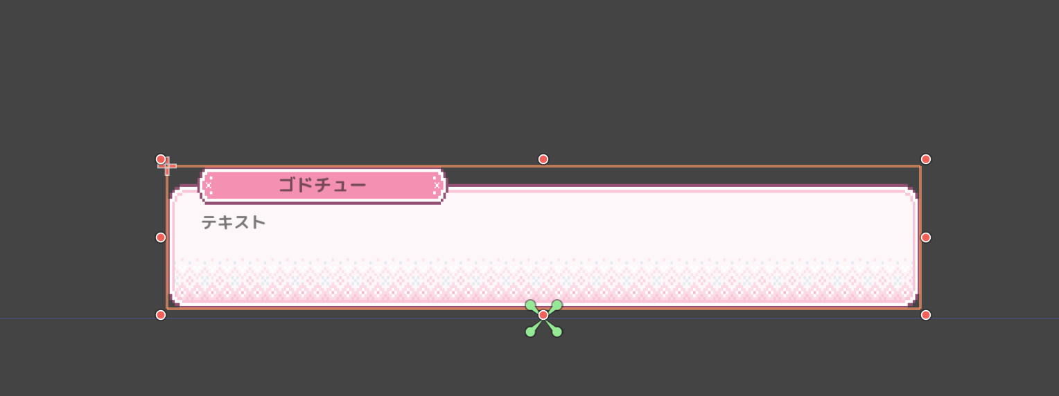 CharacterSpeakPanelはお好みのテキストの枠を設定してください。CharacterName: 発言しているキャラの名前表示 CharacterText: 実際のセリフを表示するNext: 次に進むためのアイコン(クリックやタップの目印) 下記のようにお好みでデザインを設定してください。