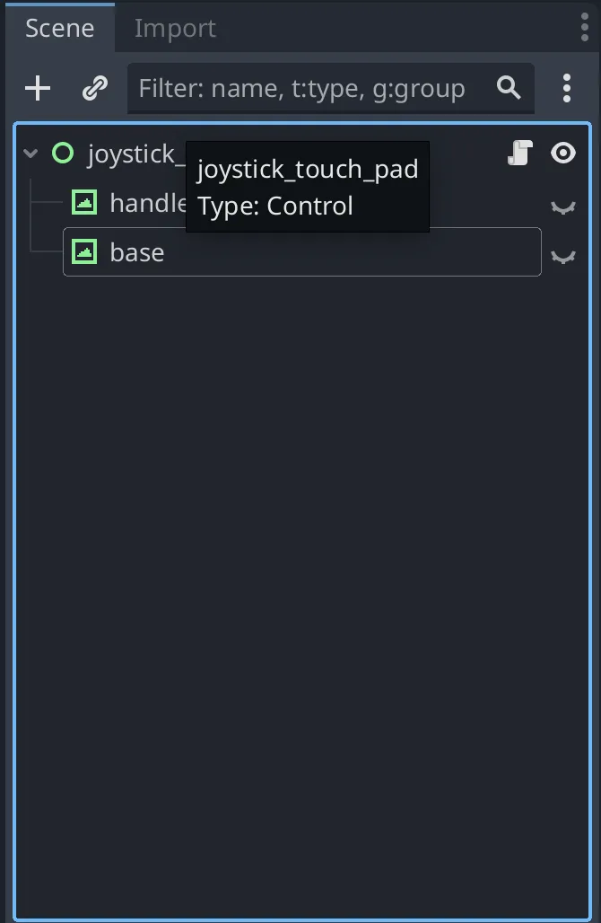 base(ジョイスティックの土台)とhandle(ジョイスティックのハンドル)用にTextureRectノードを追加。