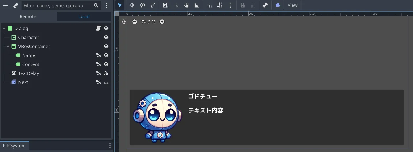 # ダイアログウィンドウのUI要素を取得@onready var character_name = $VBoxContainer/Name # キャラクター名表示用@onready var content = $VBoxContainer/Content # ダイアログ本文表示用@onready var next = $Next # テキスト表示が終了合図@onready var text_delay = $TextDelay # テキストの表示遅延タイマー