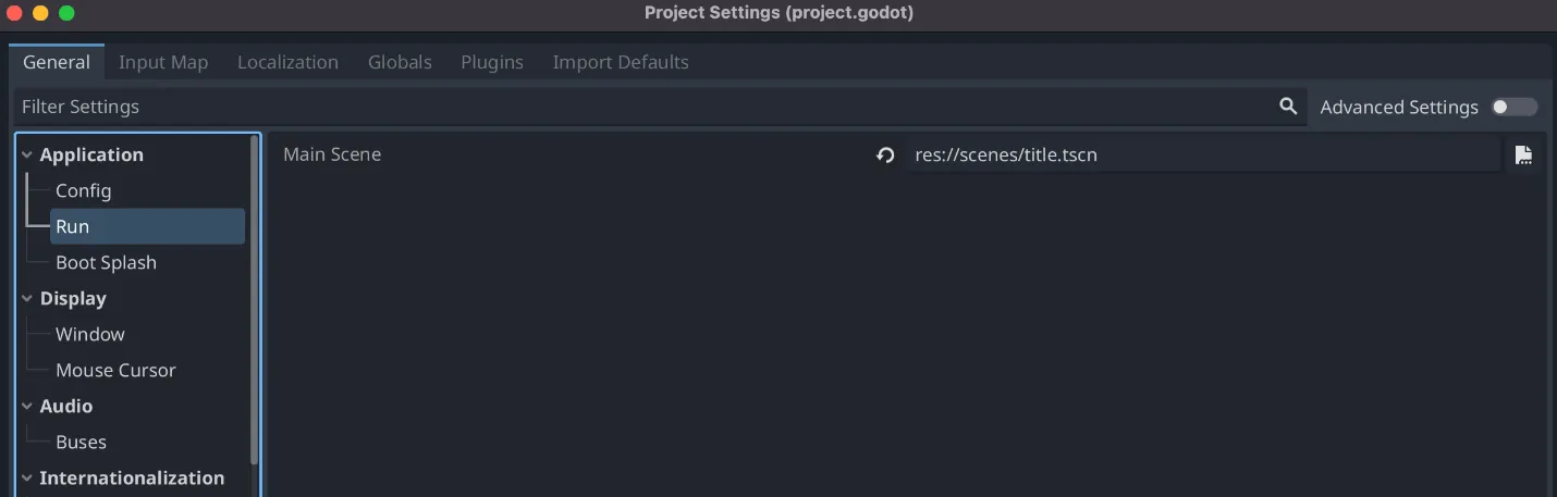 Project -> Project Settings)のMain Sceneを title.tscn に設定します。