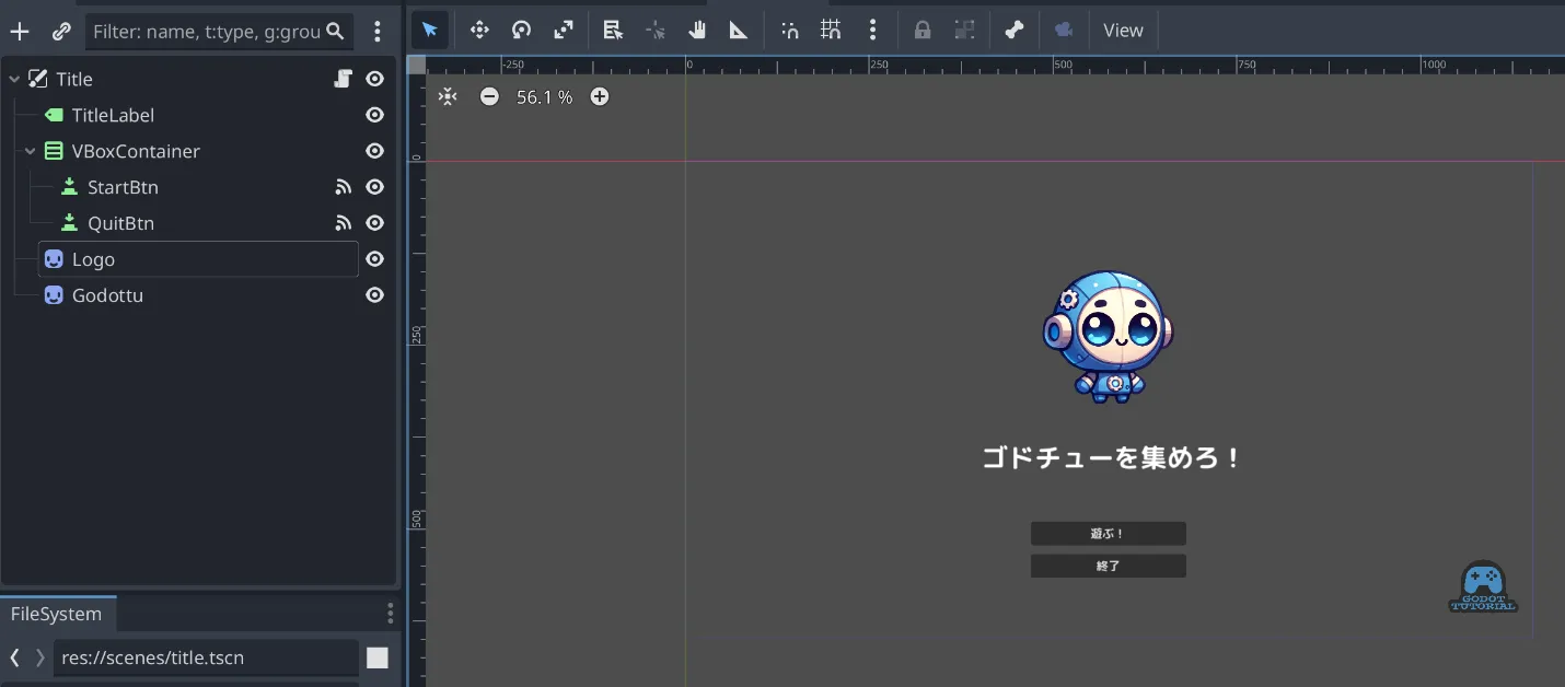 プロジェクトを実行し、タイトル画面が正しく表示されることを確認します。